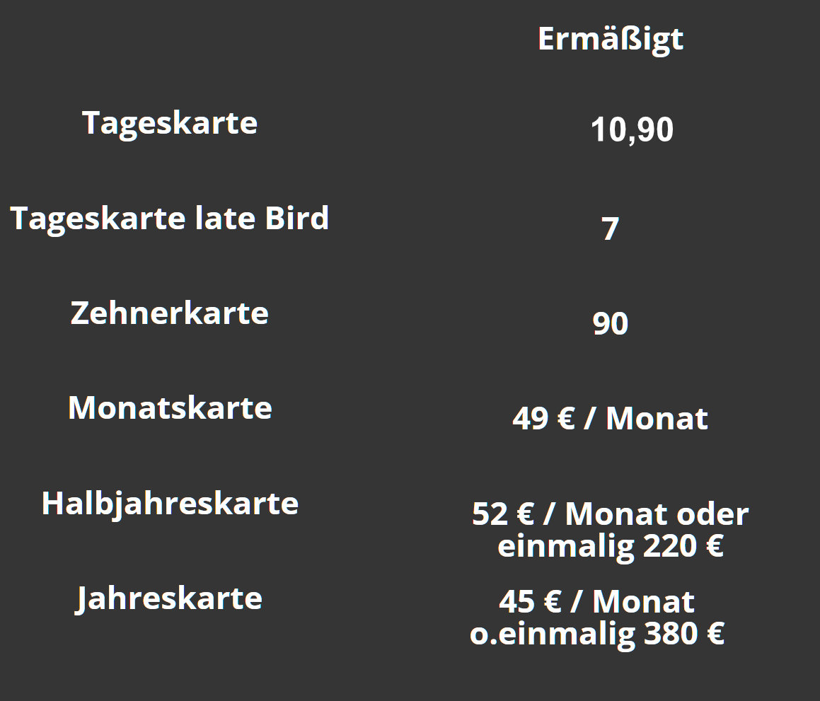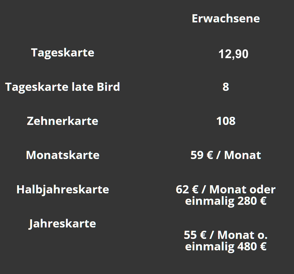 Kinder in Begleitung Erwachsener die eine Zeitkarte-/Abo haben ( Elferkarte, Monats,-Halbjahres,-Jahreskarte/Abo) zahlen nur 7,- im Tagestarif bzw. 5,- im LateBird-Tarif.