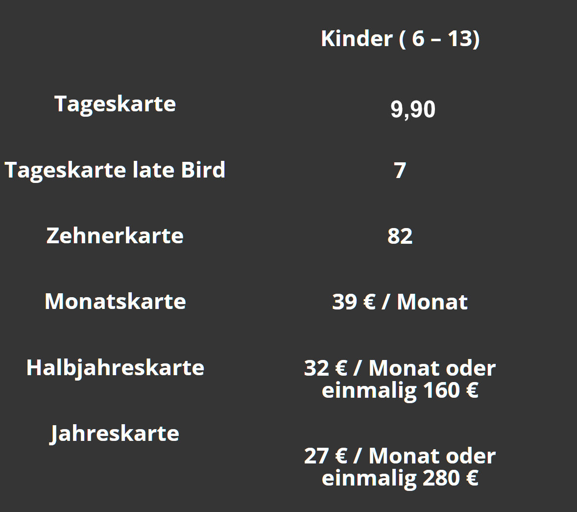 Kinder in Begleitung Erwachsener die eine Zeitkarte-/Abo haben ( Elferkarte, Monats,-Halbjahres,-Jahreskarte/Abo) zahlen nur 6,- im Tagestarif bzw. 5,- im LateBird-Tarif.